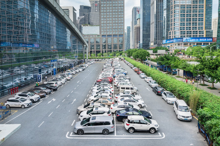 Lots of cars parked in parking lot outdoor in the city