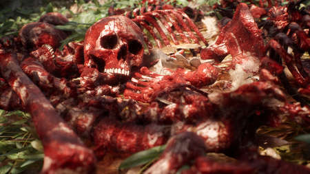 Bloody bones and skulls lie on the battlefield in the middle of the forest. War and apocalypse concept. 3D Rendering.