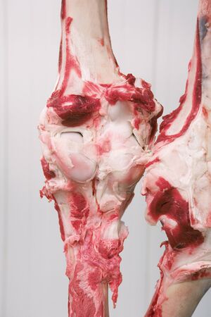 Meat industry, meats hanging in cold store. Cattles cut, hanged on hook in a slaughterhouse