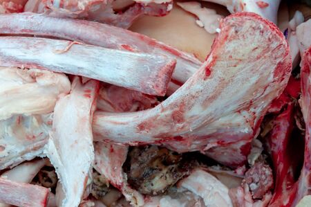 Fresh raw cow and pig bones with blood and remnants of meat and skin. Waste from the meat trade