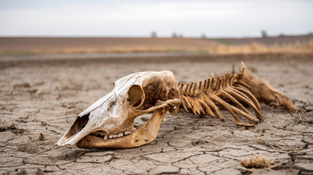 Skeleton of a cow lying in a drought-ravaged field. Water crisis and water shortages in summer during prolonged drought