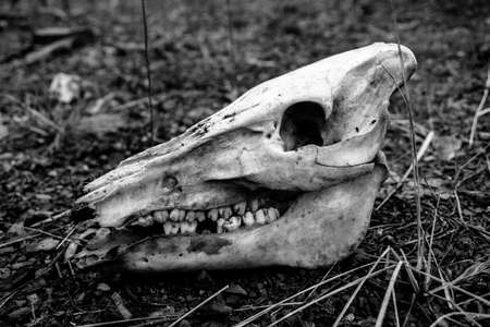 a Black and white shot of an animal skull on the ground