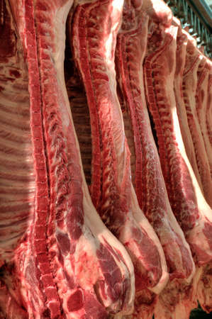 Meat industry, meats hanging in cold store. Cattles cut, hanged on hook in a slaughterhouse