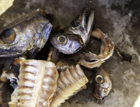 Raw and bad fish heads in the street, animal waste, fishmonger