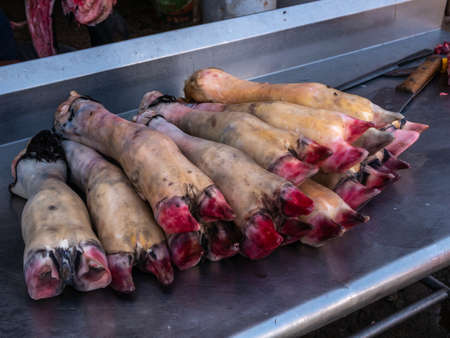 Cow legs for sale at the counter of the local market.