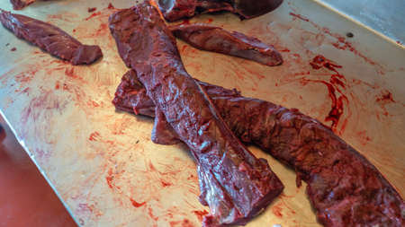 Chunks of beef brisket lie on the butcher's counter in the market. Background. Texture.