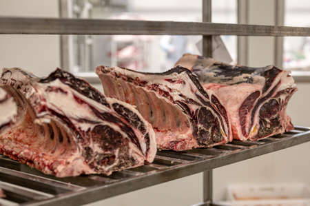 Large pieces of beef ribs. The process of fermentation of meat in the factory.