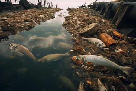 A dead fish floating in contaminated water surrounded by litter and pollution waste