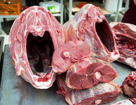 Fresh lamb on the counter of the meat pavilion