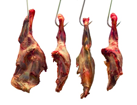 Bucharest, Romania - April 16, 2020: Lamb carcass hang from iron hooks for sale in a Romanian butcher shop before Easter.