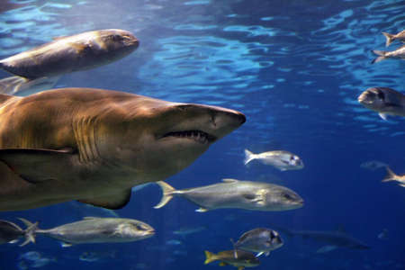 Sand tiger shark Carcharias taurus is swimming in the blue water