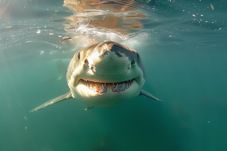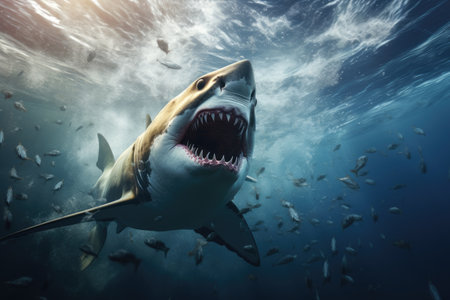 A threatening great white shark prowls the depths, its cold, piercing eyes and rows of razor sharp teeth a chilling testament to the perilous nature of shark encounters. Generative AI