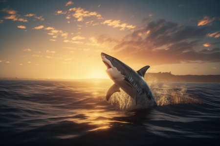 A shark leaps out of the water, its sharp teeth bared against a vibrant sunset sky, creating a thrilling and awe-inspiring moment in this stock photo. AI Generative.