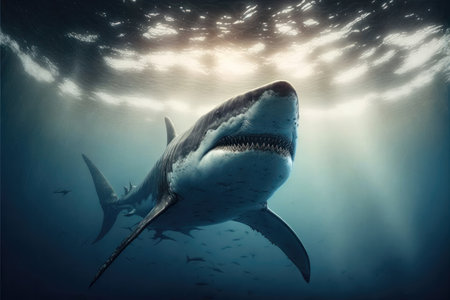 Majestic great white shark swimming in the ocean depth with sunlight filtering through the water
