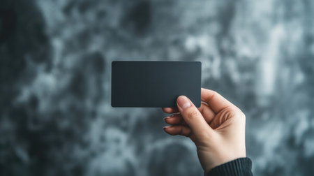 A sleek black gift card is being held in a hand against a textured backdrop, allowing for custom text or design placement.