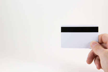 Hand holding blank credit card isolated on white