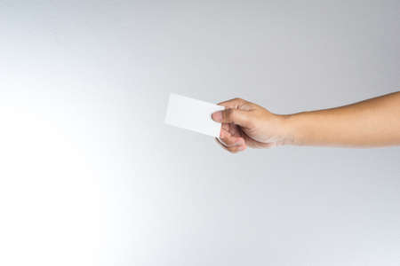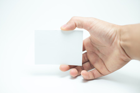 Hand hold blank card or paper on white background