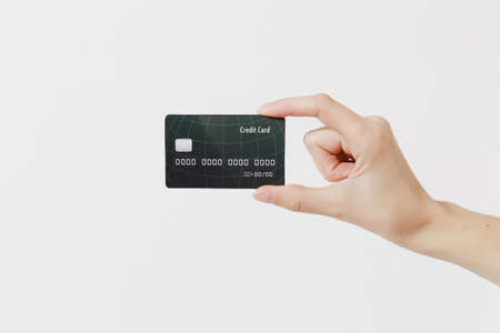 Close up female holds in hand credit bank card isolated on white background. Finance design, currency concept. Copy space for advertisement. Advertising area