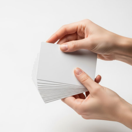 holding a white card on white background.