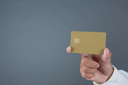 Casual young businessman at blue background giving credit card with fingerprint scanner on its front side. Close up shot focused on the male hand holding the payment card with biometric scanner