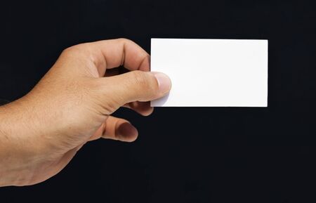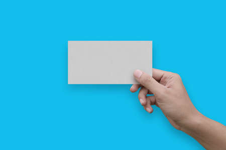 Hand holding an empty business card on white background