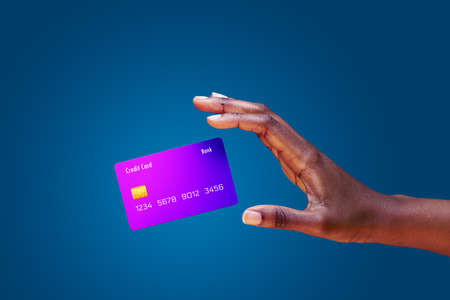 Close up african american female hand and levitating mockup bank credit card with online service on blue background