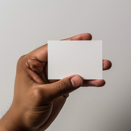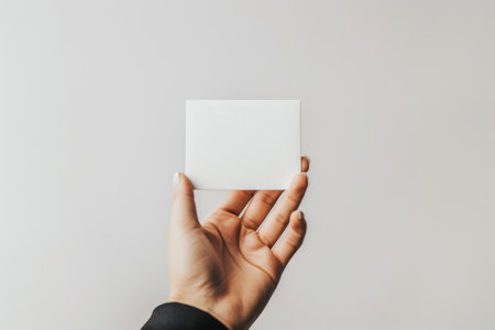 The image features a hand holding a white card against a white background. The hand is positioned such that the fingers are wrapped around the card, with the thumb resting on the front. The background is plain white, providing a stark contrast to the hand and the card. This image is ideal for various graphic design purposes and can be used for creating minimalistic layouts.