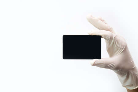 A hand in a white protective glove holds the credit card on a white background.
