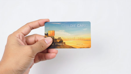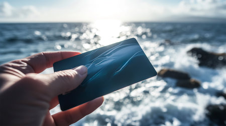 Close-up of a hand holding a credit card with the sea in the background.travel and tourism concept
