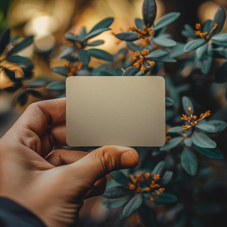 A white business card is delicately held in a hand against the backdrop of a lush green tree, merging business and nature.