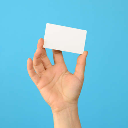 female hand holding a white black business card, blue background