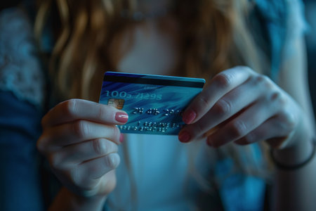 Close-up A woman uses her hand to hold a credit card used for paying with an online product card.
