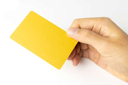 Hand holding a red credit card on a yellow background, credit card can be used to pay for goods or services, credit card concept.