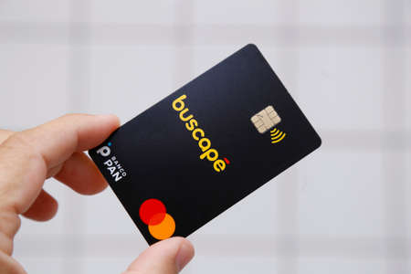 Minas Gerais, Brazil - November 13, 2021: Buscape Pan bank logo credit card and Mastercard brand