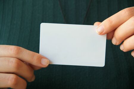 Close up woman hands reciving white plastic card.