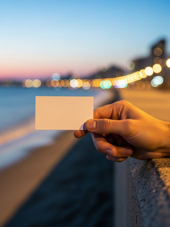 Hand holding blank business card with city lights in the background at sunset