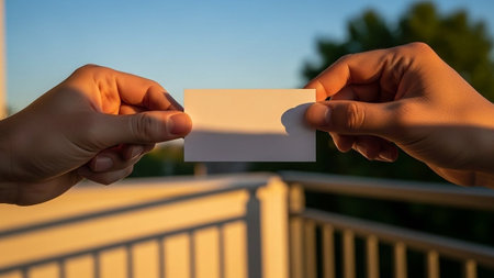 Two hands holding a white business card with copy space on the balcony
