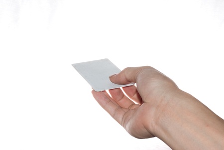 Woman holding credit card over white bacground in her right hand. Beautiful hand of woman represented over white background.