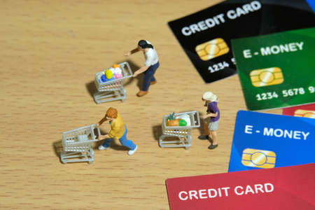Contact-less payment. Group of people shopping using electronic money (e-money). Miniature people figurines toys conceptual photography.