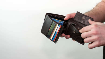 A man looks into an empty wallet without money, a wallet with credit cards. On white background.