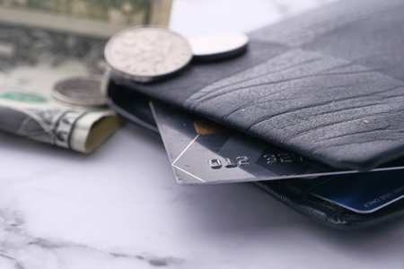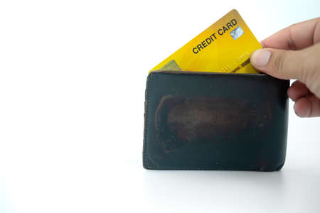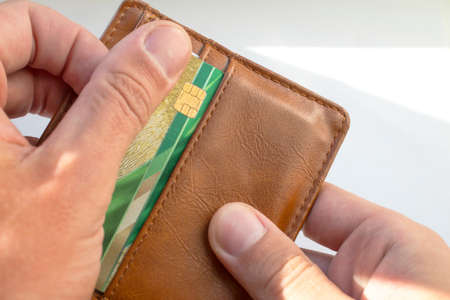 Cropped shot view of female hands picking credit cards from her wallet. Credit card lets cardholders borrow funds with which to pay for goods and services depend on the condition.