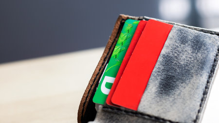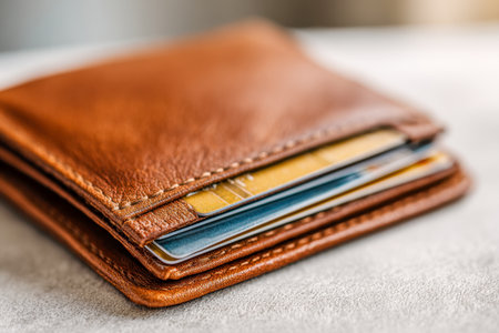 A rich brown leather wallet brimming with colorful cards lays on a plush, subdued background, highlighting daily routines and the importance of financial tidiness.