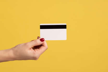 Profile side view closeup of human hand holding classic credit card, earning money, banking. Indoor studio shot isolated on yellow background.