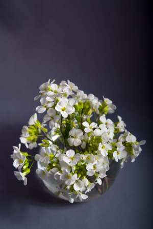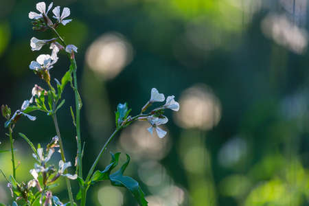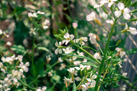A closeup shot of White blossoms of oilseed radish (Raphanus sativus var. oleiformis) in an India garden.