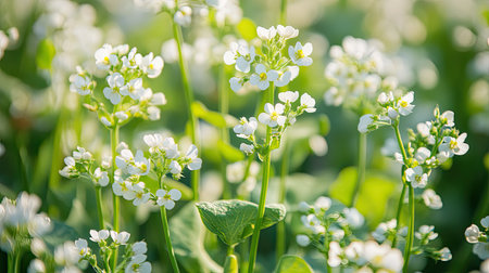 Close-up of blooming buckwheat flowers in a sunlit field, capturing their delicate white petals and vibrant green stems