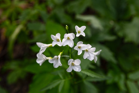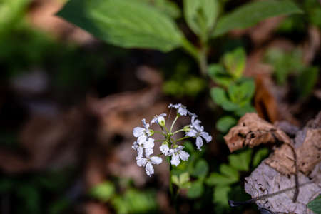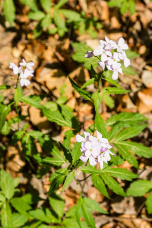 View from above. Groundcover plant - Dentaria bulbifera L. (Cardamine bulbifera (L.) Crantz) - a plant that blooms in the forest.