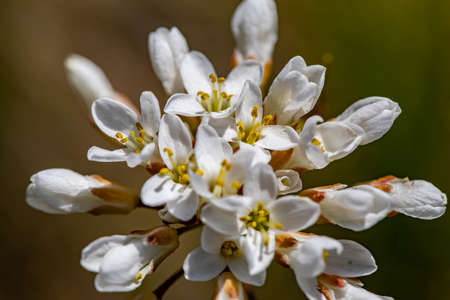 Blooming white flowers. Nature flora background. Macro closeup.