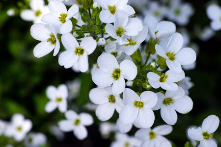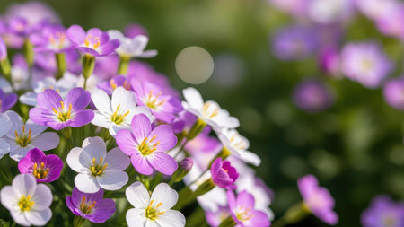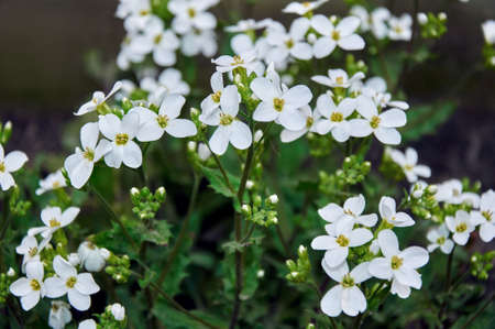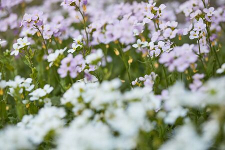 blooming white and pink flowers in garden. arabis flowers in field at sunny summer or spring day.
