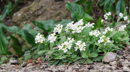 Cardamine trifolia flower in mountains, close up shoot