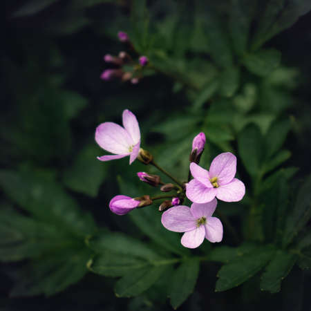 Beautiful lunaria rediviva, perennial honesty, species of flowering plant in the cabbage family Brassicaceae, pale pink flower in spring and summer, growing again, reviving, close up